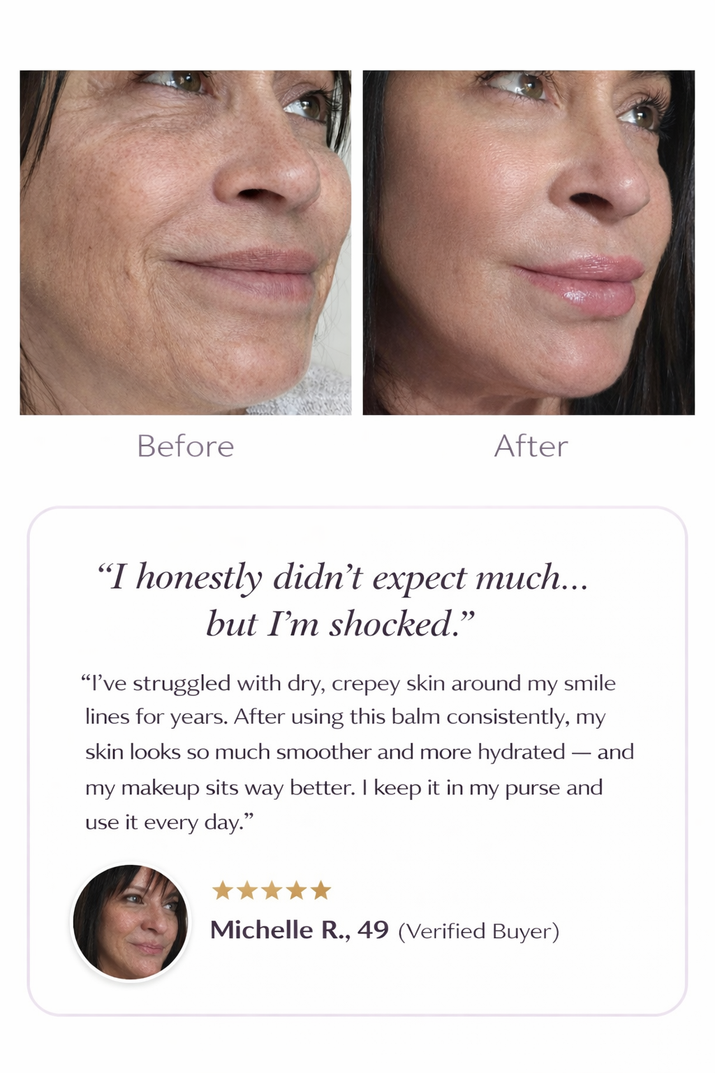 This balm is designed to support deep hydration, smoother-looking skin, the appearance of plumpness, and the look of fine lines & dry texture over time. Results may vary.