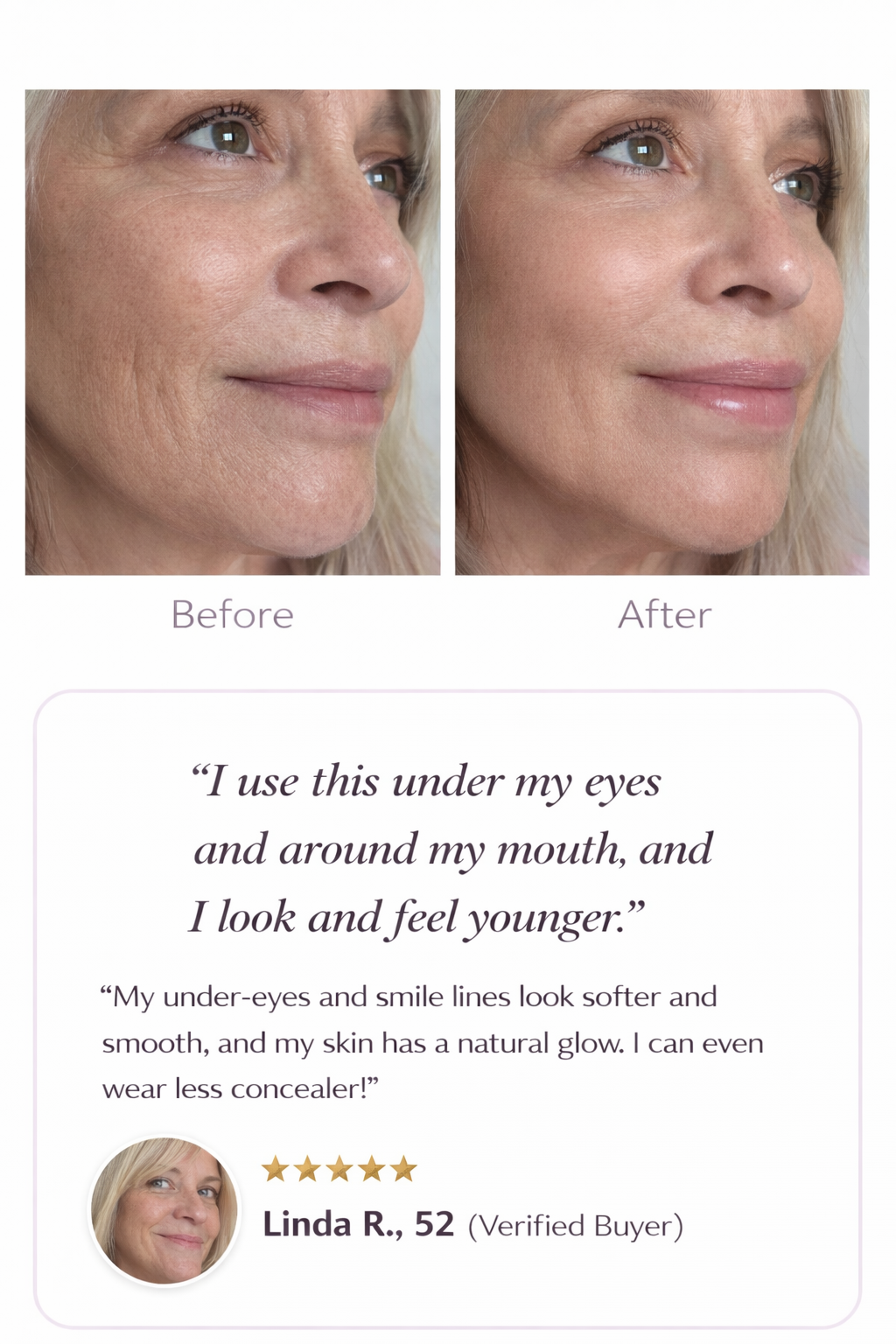 Step 1: Swipe gently onto areas like under-eyes, smile lines, forehead, neck, or dry spots.